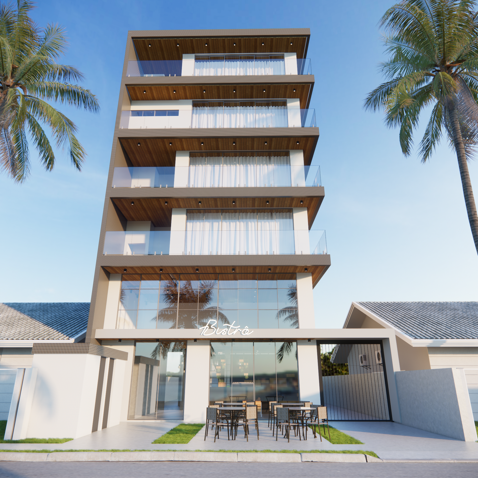 Serviço: Projeto arquitetônico e 3D para edifício de uso misto, com térreo comercial e 3 apartamentos residenciais.